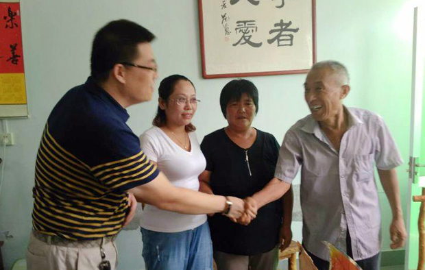 陽信鴻安集團(tuán)愛心志愿者團(tuán)隊(duì)得到智障青年王登華需要找家的消息后,第一時(shí)間在新聞媒體發(fā)了找家啟示,并在微信朋友圈廣泛傳播,并附王登華照片,經(jīng)過三天三夜的不懈努力,王登華村里的大隊(duì)書記通過微信認(rèn)出了王登華,并及時(shí)通知了王登華的姑姑、姑父,正在到處尋找王登華的夫婦兩個(gè),喜出望外,立即騎著三輪車趕到陽信縣信城老年服務(wù)中心去接王登華,才出現(xiàn)了開頭感人的一幕。
