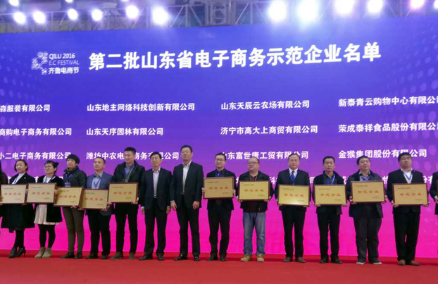 12月18日,由山東省商務(wù)廳指導(dǎo),山東省電子商務(wù)促進(jìn)會主辦的2016“有范兒”齊魯電商節(jié)年度盛典在濟(jì)南舜耕國際會展中心開幕。公司榮獲“山東省電子商務(wù)示范企業(yè)”和“山東省優(yōu)秀電商網(wǎng)絡(luò)零售企業(yè)”雙稱號,常務(wù)副總經(jīng)理馮惠棣出席盛會合作運(yùn)營商淘碼公司總經(jīng)理楊毅接受獎牌。