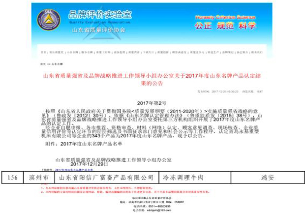 2017年12月29日,山東省質(zhì)量強(qiáng)省及品牌戰(zhàn)略推進(jìn)工作領(lǐng)導(dǎo)小組辦公室發(fā)布了關(guān)于2017年度山東名牌產(chǎn)品認(rèn)定結(jié)果的公告。我公司生產(chǎn)的“鴻安牌”冷凍調(diào)理牛肉榮獲“山東名牌”稱號(hào)。